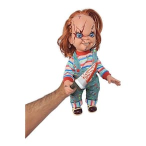 Acessório Mortal: Em sua mão, uma faca de plástico, símbolo de suas travessuras assassinas, prometendo reviver as cenas mais icônicas dos filmes.
