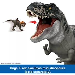 - As articulações possíveis e divertidas carnívoras estão prontas para movimentos de batalha, incluindo a mandíbula que abre a 35 graus, pronta para "engolir" miniaturas de dinossauros. (Mini dinossauros vendidos separadamente)