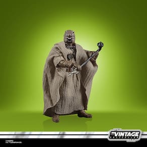 A coleção vintage Star Wars é criada na mesma embalagem dos bonecos autênticos de Star Wars de 1977. A linha inclui bonecos articulados de todo o universo Star Wars. Estes bonecos são dimensionados na linha de 9,5 cm. Elas são sugeridas para crianças a partir de 4 anos e contêm peças pequenas que não são recomendadas para crianças a partir de 3 anos. - Boneco em escala de 9,5 cm com capa removível, bengala e cajado. - Comemorando os 50 anos da Lucas Films. - Apresenta Tusken Raider, também conhecido como Sand People do Episódio IV: Uma Nova Esperança.