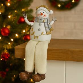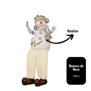 Boneco de Neve Decorativo Sentado com Perna Mole – Resina 18cm Branco e Dourado