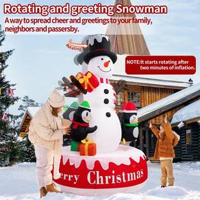 - Infláveis giratórios de Natal Snowman de 8 pés --- Os infláveis de Natal Snowman com caixas de presente coloridas e pinguins divertidos apresentam design giratório, giram para a esquerda e para a direita. Uma forma de espalhar alegria e saudações para sua família, vizinhos e transeuntes. Esse movimento dinâmico adiciona um elemento único e interativo à sua decoração natalina.