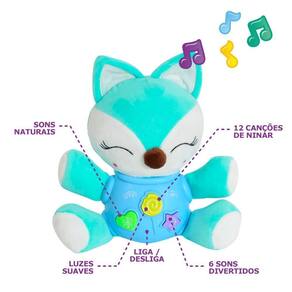 Buddys fox possui uma parte macia em pelúcia antialérgica e outra parte interativa com 12 canções de ninar, 6 sons divertidos, sons naturais e uma luz suave para tranquilizar as noites do seu bebê. E ainda quando chacoalhado, emite o som contagiante da risada de um bebê.
