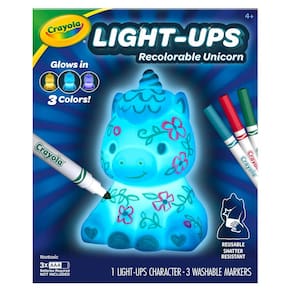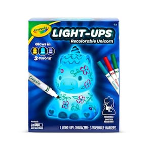 Boneco de unicórnio Crayola Light Ups, brinquedo recolorível Light Up, presente para crianças, 5, 6, 7, 8 — LIGHT UPS UNICORN: possui 1 personagem Light Ups recolorível, 3 marcadores laváveis (surfe magenta, verde e turquesa) e uma folha de instruções. - ATIVIDADE DE COLORIR PARA CRIANÇAS: Crie durante todo o ano com um personagem recolorível que se ilumina. Limpe facilmente os marcadores FX sempre que estiver pronto para começar um novo design colorido! - BRINQUEDO ILUMINADO: Este brinquedo iluminado brilha em 3 cores, incluindo roxo, amarelo e azul claro. Quando terminar de colorir seu personagem, use o temporizador de luz de 4 horas para exibi-lo e se divertir. - SEGURO E NÃO TÓXICO: ideal para crianças de 4 anos ou mais! - NOTAS GERAIS: Este brinquedo infantil requer 3 pilhas AAA (não incluídas).