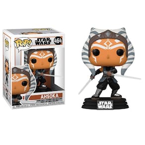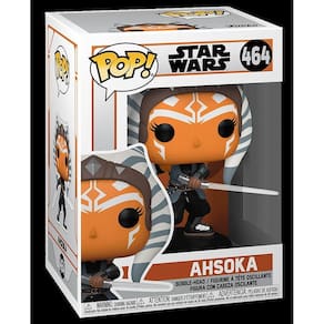 - De Star Wars: The Mandalorian, Ahsoka Tano com sabres de luz, como um vinil POP estilizado da Funko!