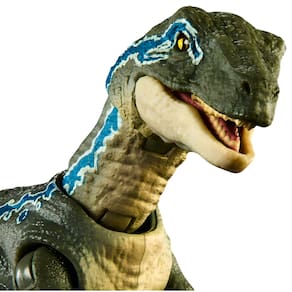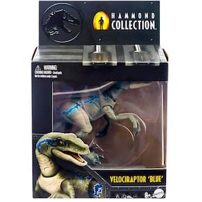 Blue expande a Hammond Collection de figuras de dinossauros, representando o personagem velociraptor do primeiro filme Jurassic World. Com 20 centímetros de comprimento, a figura tem um design autêntico vindo diretamente do cinema, incluindo olhos de vidro premium, coloração distinta e pés mais precisos do que as figuras anteriores. As articulações, incluindo uma mandíbula que se abre em 65 graus, proporcionam ótimas possibilidades de poses.