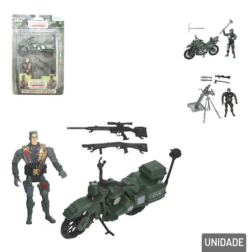 O kit inclui 4 peças, sendo o Boneco e seus acessórios, moto e equipamentos táticos, permitindo que as crianças criem cenários e histórias cheias de emoção. Cada boneco é feito de plástico durável e seguro, ideal para brincadeiras tanto dentro de casa quanto ao ar livre.