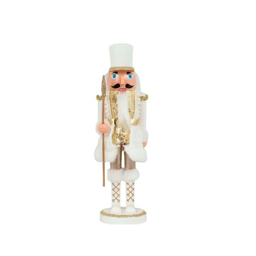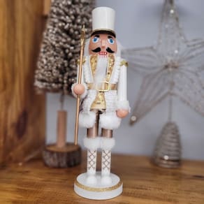 Este Quebra-Nozes decorado em branco e dourado é a peça de luxo que vai elevar sua decoração natalina. Com 28cm de altura, ele é adornado com um bastão com uma estrela dourada brilhante e um chapéu macio em pelúcia, que trazem sofisticação e charme. Além de sua beleza, esse Quebra-Nozes conta com um braço esquerdo articulado e uma boca funcional, acionada por uma alavanca em plástico, tornando-o não apenas decorativo, mas também interativo. Ideal para decorar entradas, mesas ou prateleiras, essa peça é perfeita para quem busca elegância e tradição com um toque de diversão.