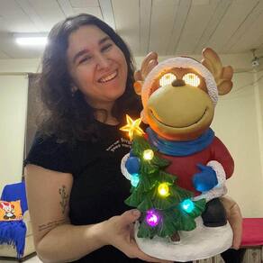 Ela toca músicas natalinas clássicas e, como por mágica, mexe os olhos! Com um brilho especial no olhar e uma melodia festiva, ele transforma qualquer ambiente em um verdadeiro espetáculo de Natal.
