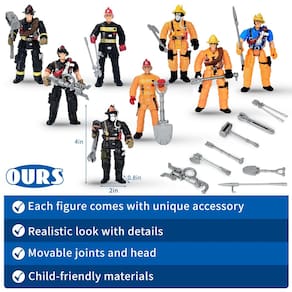 Nosso conjunto de 8 peças de bonecos de bombeiro, uma coleção dinâmica de bonecos de brinquedo de 10 cm projetados para crianças a partir de 3 anos. Estes brinquedos vibrantes de bombeiro vêm com vários acessórios, incentivando brincadeiras imaginativas enquanto as crianças criam seus próprios cenários de resgate. Perfeito para meninos e meninas, este conjunto é um presente ideal para aniversários, meias de Natal ou lembrancinhas de festa, inspirando um senso de heroísmo e aventura nas mentes jovens. - Conjunto de 8 bonecos de ação: contém 8 brinquedos de bombeiro usando chapéus e muitos acessórios - marreta, pás, machados, chave de gás, barra halligan, mastro de lúcio, cortadores de parafuso, que permitem que as crianças criem cenários emocionantes de combate a incêndios, promovendo a criatividade e habilidades de resolução de problemas - Detalhes realistas: estes bonecos são intrincadamente projetados para se assemelhar a bombeiros reais. Cada boneco tem aparência realista, as crianças podem imaginar ser um herói da cidade para proteger nossa terra natal, desfrutar de uma variedade de personagens e cenários em suas brincadeiras imaginativas - Juntas móveis: cada boneco de brinquedo tem 5 juntas móveis (braços, pernas, cabeça) para facilitar a colocação durante a brincadeira. Pode ser combinado com um brinquedo de caminhão de bombeiros, permite que as crianças participem de brincadeiras interativas, incentivando-as a se envolver em encenações e inspirando a criatividade e a imaginação das crianças - Presente perfeito para crianças: ajude seus filhos a entender como os bombeiros resgatam pessoas, forneça cursos de educação de resgate vívidos para seus filhos. Será um presente memorável e agradável para crianças que querem ser heróis, perfeito para aniversário, Natal, Ano Novo, Páscoa e assim por diante - Durável e seguro: todos os brinquedos são feitos de plástico durável e BPA, 100% seguro para crianças. Os bonecos de 10 cm são adequados para mãos pequenas, as crianças podem brincar facilmente e desfrutar de horas de entretenimento. Brinquedos ideais para meninos e meninas de 3, 4, 5, 6, 7 anos ou mais