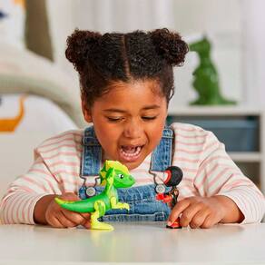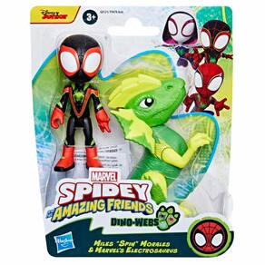 Este conjunto de bonecos de ação inclui um boneco articulado do super-herói Miles “Spin” Morales com aproximadamente 10 cm em seu traje Dino-Web, e também, uma figura articulada do Electrosaurus para incentivar grandes aventuras.