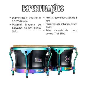 Bongo meinl percussion spectrum 7 8 1/2 Os bongôs da linha spectrum series representam uma fusão entre construção artesanal de alto padrão e versatilidade sonora. Pensados para músicos exigentes, sua qualidade profissional atende desde o ambiente controlado de estúdios de gravação até o dinamismo dos palcos e a leveza de uma jam session entre amigos. Seu timbre é um dos principais destaques: rico em harmônicos, limpo nos ataques e com ressonância equilibrada, proporciona uma base sólida para qualquer estilo musical. Especificações: Cor: preto Diâmetros: 7 macho e 8 1/2 hembra Material: carvalho siam Característica 1: aros arredondados ssr de 3 mm Característica 2: hardware exclusivo da linha spectrum series Característica 3: peles naturais true skin Característica 4: sistema de suspensão meinl free ride com patentes registradas na alemanha Incluso: bolsa de acessórios, chave de afinação em l e óleo de manutenção Marca: Não Informado