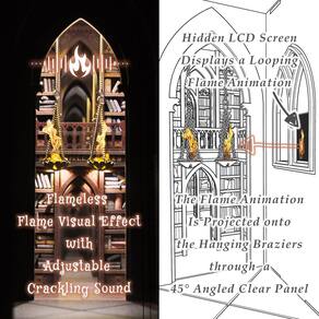 - [Flameless Flame Illusion] Inclui um kit eletrônico de alto desempenho com uma tela LCD que exibe continuamente um efeito de chama em loop, projetado em braseiros suspensos, com som crepitante e volume ajustável, criando uma atmosfera aconchegante para seus momentos de leitura.