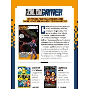 HISTÓRIAS E PESQUISAS INTERESSANTES SOBRE JOGOS, PERSONAGENS E ESTÚDIOS RETRÔ. Conheça os dinossauros e os perigos da ilha misteriosa de Dino Crisis, um clássico do gênero survival horror, na edição #8 da Coleção OLD!Gamer. Embarque também em um corrida alucinada pela evolução de Crazy Taxi, conheça Renato Degiovani, o pioneiro na criação de jogos brasileiros, e pilote trens com controles bem exóticos. A coleção OLD!Gamer conta com doze livros de grandes clássicos: EarthBound, Dino Crisis, Indiana Jones and the Fate of Atlantis, Rock n’ Roll Racing, River Raid, The Simpsons Bart vs the Space Mutants e outros seis livros já lançados. Volume 8 da OLD!Gamer Bookzine.