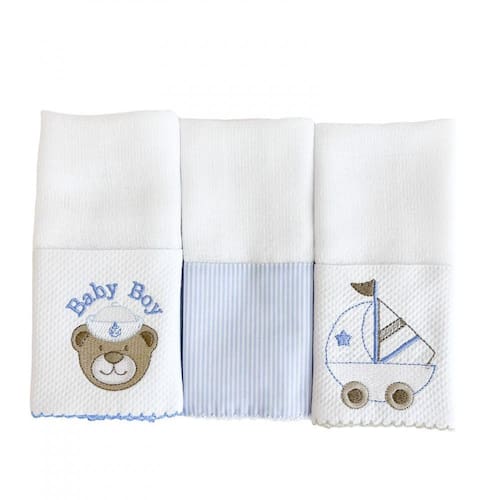 A Fraldinha de boca Cremer da Coleção Navy Baby Boy Azul tem uma embalagem com 3 fraldinhas bordadas de boca com acabamento em crochezinho, super delicado. Fralda Cremer podendo ser lavada na máquina sem perder sua maciez. Lindo também para presentear.
