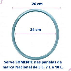 Nosso empenho é procurar o que há de mais atual e funcional no mundo culinário e para organização da sua casa, priorizando sempre a qualidade e a versatilidade dos produtos. Kit borracha panelas nacional 5 / 7 / 10 litros Este kit contém: 1 borracha de silicone para panelas marca nacional 5 / 7 / 10 litros de fechamento externo 2 válvulas de segurança de borracha 1 peso pino preto e vermelho Borracha para panelas marca nacional com fechamento externo de 5 / 7 / 10 litros. As borrachas de silicone 100% atóxico, não ressecam, são melhores para o desempenho da sua panela, fazendo com que a vedação seja total O anel de vedação deve ser substituído sempre que ficar rígido ou quebradiço. Medidas da borracha: Diâmetro externo: 26 cm Diâmetro interno: 24 cm; Fique atento à algumas dicas de uso: - jamais coloque a panela quente embaixo da água fria, esse choque térmico causa deformidades no alumínio; - mantenha sempre o pino central limpo, faça a limpeza com algo de metal, não use palito de dente, ele pode quebrar e você precisará trocar a peça; - prefira cozinhar em fogo baixo, o tempo é o mesmo e evita que a água seque mais rápido. Manutenção em dia = panela segura Gostou Esse produto pode ser seu aguardamos sua compra Marca: Não Informado