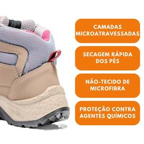 Calçado ocupacional tipo tênis, cano alto, confeccionado em microfibra e tecido dupla frontura, com forração em nylon e biqueira de polipropileno. Solado bidensidade em PU, resistência ao escorregamento (SRC) e absorção de impacto (E). Com fechamento em cadarço ilhós tipo gorgurão retro refletivo e passador plástico de alta resistência.