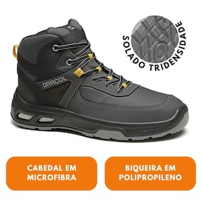Calçado ocupacional tipo tênis, cano alto, confeccionado em microfibra e napa soft, com forração em tecido absorvente e biqueira de polipropileno. Solado tridensidade em PU, resistência ao escorregamento (SRC) e absorção de impacto (E).