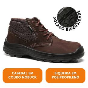 Calçado ocupacional de amarrar, tipo tênis, cano alto, com colarinho acolchoado, confeccionado em microfibra hidrofugada gáspea em fibra de poliéster e cano em napa soft micro perfurada , com forração interna da gáspea em não tecido e forro do cano em tecido com alto poder de absorção bico em polipropileno, palmilha de montagem em não tecido, costurada pelo sistema strobel, palmilha de conforto removível para higienização em PU 8,5 mm na região calcânea e 3,5 mm na região plantar , solado de poliuretano (PU) tridensidade, constituído por três camadas, injetado diretamente no cabedal, com resistência a escorregamento (SRC) e com absorção de impacto na região do calcanhar (E).