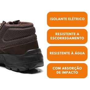 Calçado tipo botina isolante elétrico, palmilha interna removível, biqueira plástica, solado de poliuretano bidensidade injetado direto no cabedal e resistente ao escorregamento e sistema de absorção de energia na região do salto.