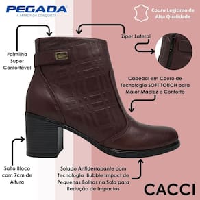 O solado antiderrapante conta com a exclusiva tecnologia Bubble Impact, que traz pequenas bolhas na parte inferior para reduzir os impactos ao caminhar, aumentando a sensação de leveza e proteção em cada passo. O salto bloco de 7 cm proporciona a altura ideal, combinando elegância e estabilidade para diversas ocasiões. Além disso, o modelo conta com um prático ecler lateral, que facilita o calce e traz ainda mais praticidade ao dia a dia. Moderna, versátil e extremamente confortável, essa bota é perfeita para te acompanhar em todas as estações.