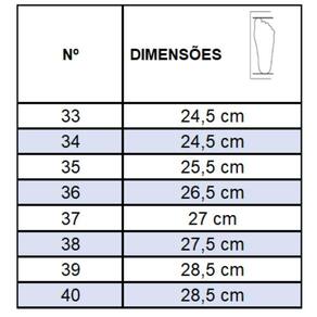 Recomendações de Uso: A limpeza do calçado pode ser feita com detergente neutro e pano úmido. Não deixar submerso em água e não utilizar nenhuma forma de calor para secar. Guardar em local sem umidade.