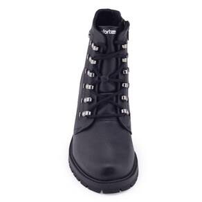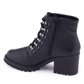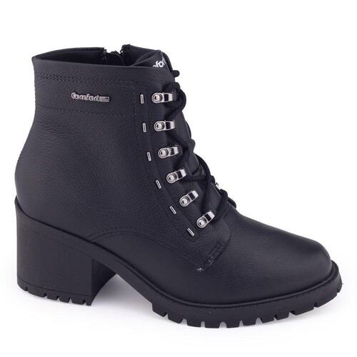 Bota coturno tratorado cano baixo Comfortflex 23-77302 é um lindo modelo em cor sólida e detalhes minimalistas. Seu cabedal é produzido em couro liso, possui como detalhe seus passadores superiores dourados, seu ajuste é em cadarço, mas o fechamento é por ziper na lateral interna para facilitar o calce a bota é toda forrada internamente proporcionando maior conforto. Sua palmilha é fixa, macia e revestida. A bota traz um bom encaixe ao pé e facilidade em calçar, seu bico é arredondado e o salto fachetado médio possui 5cm de altura traseiro e 1,5cm de altura frontal. Seu solado é levemente tratorado e possui frisos para maior segurança.
