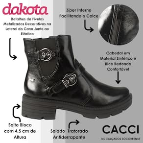 O destaque do modelo são as tiras com regulagem metalizadas decorativas no cano e a peça em elástico aplicada no cano, que agregam estilo. Além de ser fácil de calçar, conta com fechamento pratico na lateral do cano. Versátil e prática, a bota Dakota combina com diversos looks, desde vestidos e saias até jeans e camiseta.