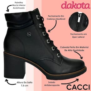 O salto bloco alto de 7,5 cm garante estabilidade e sofisticação ao caminhar, enquanto a sola tratorada oferece firmeza em cada passo. Seu cano possui 15,5 cm de altura e 18,5 cm de circunferência, proporcionando um ajuste confortável ao tornozelo, com cadarços que permitem adaptar perfeitamente aos pés. Com peso leve de 0,932 kg, essa bota entrega conforto sem pesar.