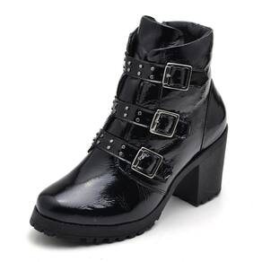 Bota Coturno Haldrys de Couro Tiras com Fivelas em Verniz e Salto Grosso Medio - 36 - Preto