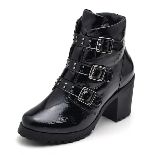 Bota Coturno Haldrys de Couro Tiras com Fivelas em Verniz e Salto Grosso Medio - 39 - Preto