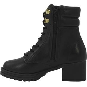 O fechamento por cadarços tradicionais, com passadores superiores de metal, acrescenta um charme especial, enquanto o zíper na lateral interna proporciona praticidade no calce. O conforto é uma prioridade nesta botinha, com forro interno e palmilha acolchoados, permitindo que cada passo seja uma experiência agradável. O salto baixo, com altura de 4,5 cm, adiciona um toque de elegância e charme aos looks.