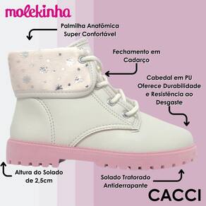 Encante os passinhos da sua pequena com a elegância e o conforto da Bota Feminina Infantil Molekinha.Projetada com detalhes encantadores e materiais de alta qualidade, esta bota é perfeita para acompanhar as aventuras diárias das crianças.