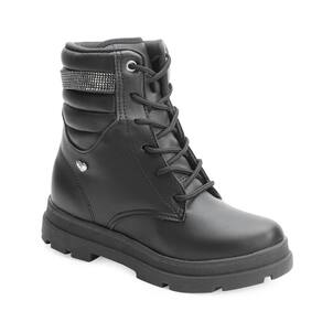 Nome: Bota Coturno Kidy KD24-36300. Gênero: Menina. Indicado Para: Moda. Estilo da Peça: Casual. Ocasião: Dia a dia. Material Externo: Alternativo com recortes e costuras. Material Interno: Têxtil acolchoado. Detalhes: Pin da marca na lateral externa e tira com aplicações de strass no cano. Fechamento: Cadarço. Palmilha: Anatômica e macia. Cano: Médio 12,5 cm de altura. Circunferência: 26 cm aproximadamente. Tipo de Solado: Levemente tratorado. Solado: Borracha antiderrapante. Peso do Produto: 818 g (o peso varia de acordo com a numeração). Garantia do Fabricante: Contra defeito de fabricação. Origem: Nacional. Código Produto: 04070276. Marca: Kidy.