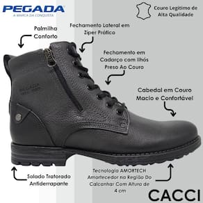 O coturno pegada de couro é um calçado resistente e durável, ideal para diversas atividades do dia a dia. O couro é um material nobre e naturalmente resistente, que oferece um visual elegante e sofisticado. O fechamento em cadarços e fecho ecler garante um ajuste seguro e confortável, além de proporcionar um design moderno e diferenciado.