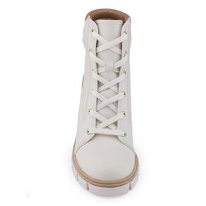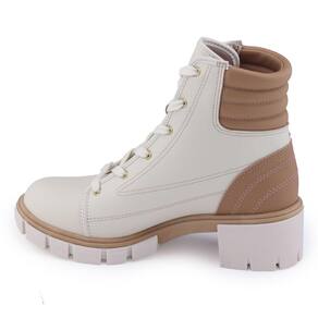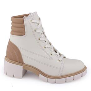 Bota Coturno Tratorada Moleca 5338.107 é um modelo que está em alta em cor Off White e detalhes tom Avelã, apresenta cano baixo com punho em material sintético macio e fechamento por cadarço largo com passadores de metal dourado. É um lindo modelo com o cabedal fabricado em material sintético napa Berlim tendo como detalhe costuras aparentes, esta bota é confortável com salto médio. A bota é toda forrada internamente proporcionando maior conforto, sua palmilha é fixa, macia e revestida. A bota traz um bom encaixe ao pé, seu bico é arredondado e o salto possui 5cm de altura e uma elevação frontal de 1,5cm. Seu solado é tratorado com frisos para maior segurança.