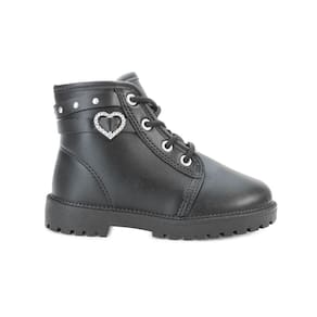 Nome: Bota Coturno Molekinha MK24-21265. Gênero: Menina. Indicado Para: Dia a dia. Estilo da Peça: Casual - Moda. Material Externo: Alternativo. Material Interno: Têxtil macio. Detalhe: Metalizado e pingente de coração. Fechamento: Cadarço. Palmilha: Forrada e macia. Altura do Cano: 7,5 cm. Circunferência: 20 cm. Tipo de Solado: Levemente tratorado. Solado: Borracha antiderrapante. Peso do Produto: 466 g (o peso varia de acordo com a numeração). Garantia do Fabricante: Contra defeito de fabricação. Origem: Nacional. Código Produto: 04070281. Marca: Molekinha.