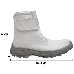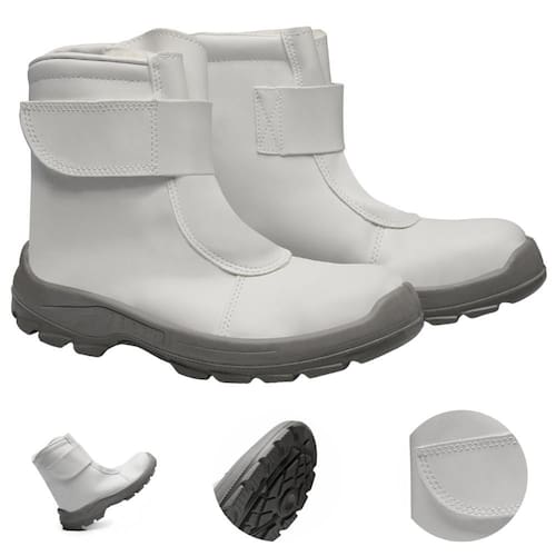 Bota de segurança branca com veIcro, cabedal construído em microfibra hidrofugada, com forração interna térmica resistente à baixas temperaturas.