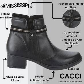 A Bota Mississipi de Cano Curto Preta é a escolha ideal para quem busca um calçado estiloso e confortável para o dia a dia. Seu design minimalista e o salto bloco de 4,5 cm garantem um visual elegante e moderno, sem perder o conforto.