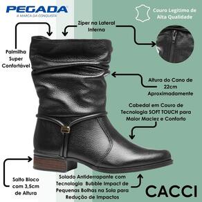 Essa bota em couro preto é extremamente confortável, estilosa e acompanha uma das maiores tendências da estação: o estilo Slouch. Ela foi desenvolvida com a exclusiva Tecnologia SOFT TOUCH da Pegada, que cuida de cada detalhe — da seleção da matéria-prima até os processos de produção — para proporcionar uma experiência de conforto supremo.
