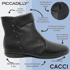 A Bota Piccadilly é um calçado versátil e elegante que combina conforto com estilo. Ela é confeccionada em material sintetico(napa) de alta qualidade, solado de borracha rasteiro antiderrapante e palmilha super-estabilidade garantindo mais segurança ao caminhar. Já o acabamento confortável e o forro superfofinho torna-a indispensável para quem precisa ficar horas de pé no trabalho. Ela oferece máxima absorção controlando tanto umidade quanto temperatura. Seu fechamento prático na lateral obtendo fácil calce. Seja para o trabalho, um evento social ou um dia casual, ela eleva qualquer look com um toque de sofisticação