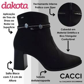 A Bota Dakota de Cano Curto é perfeita para quem busca um calçado elegante e estiloso para o dia a dia. Com design minimalista e bico fino, a bota apresenta um salto bloco alto com 7.3 cm que garante estabilidade e conforto, além de um cano curto de 15 cm e circunferência de 28 cm que facilita o calce. O destaque fica por conta das tiras no cano, que possuem brilhos e peças metalizadas, criando um visual sofisticado e moderno.