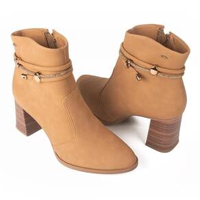 A Bota Dakota de Cano Curto Caramelo é perfeita para quem busca um calçado elegante e estiloso para o dia a dia. Com design minimalista e bico fino, a bota apresenta um salto bloco alto com 7.3 cm que garante estabilidade e conforto, além de um cano curto de 15 cm e circunferência de 28 cm que facilita o calce. O destaque fica por conta das tiras no cano, que possuem brilhos e peças metalizadas, criando um visual sofisticado e moderno.