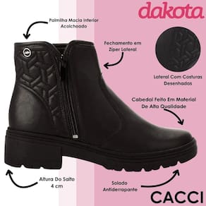 A Bota Dakota de Cano Curto é aquele clássico que toda mulher precisa ter para compor produções versáteis e cheias de estilo. Com um design minimalista enriquecido por detalhes que fazem toda a diferença, ela é capaz de transitar com facilidade entre diferentes momentos do dia, do compromisso de trabalho ao encontro descontraído com as amigas. Seu charme especial fica por conta do contraste elegante das costuras que desenham o cano em matelassê, conferindo sofisticação e um toque de modernidade atemporal. A construção com sola tratorada, aliada ao salto de 4 cm, proporciona não apenas leveza e aderência ao solo, mas também uma sensação de estabilidade e conforto a cada passo. Leve, pesando apenas 0,866 kg, essa bota abraça o pé com suavidade, tornando o caminhar mais agradável mesmo nas rotinas mais intensas. Seja combinada com jeans e camiseta para um visual casual ou com vestidos e saias para composições mais elaboradas, ela é aquela escolha certeira para mulheres que valorizam peças práticas, elegantes e cheias de personalidade. Mais do que um calçado, a Bota Dakota é um convite para se sentir confiante e confortável em qualquer ocasião.