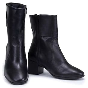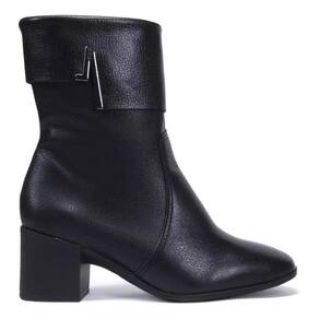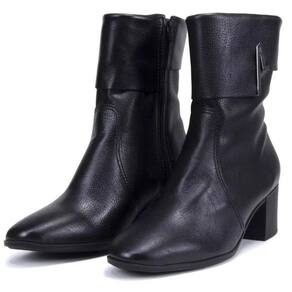 Bota cano médio Bottero é confeccionada em couro natural, com boca em couro dobrado e detalhe com enfeite metalizado. Possui salto bloco e fechamento por zíper na lateral.