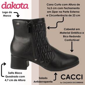 Perfeita para o dia a dia e para momentos de lazer, a bota Dakota é confeccionada em material sintético macio e resistente, garantindo conforto e durabilidade. O cano curto com altura de 16,5 cm e circunferência de 23 cm garante estilo e praticidade, enquanto o salto bloco de 4,7 cm proporciona estabilidade e segurança para você curtir seus momentos com tranquilidade. O fechamento de ecler na lateral externa do cano facilita o calce e garante um ajuste perfeito.