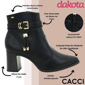 Despojada e elegante, a Bota Dakota é a escolha perfeita para mulheres que buscam um calçado atemporal e cheio de personalidade. Com um design moderno e detalhes sofisticados, ela transita com facilidade entre produções casuais e composições mais elaboradas. Seu salto bloco alto de 7 cm proporciona o equilíbrio ideal entre conforto e estilo, oferecendo estabilidade a cada passo, enquanto o bico fino acrescenta uma dose extra de feminilidade e refinamento ao visual. Os detalhes em trança e a delicada tira com aplicações metalizadas no cano, que tem 18 cm de altura e 24 cm de circunferência, são os grandes protagonistas do modelo, trazendo um toque de originalidade e charme para os pés. Prática e funcional, essa bota garante um calce fácil e confortável, além de um ajuste seguro. Produzida em material sintético de alta qualidade, alia durabilidade e resistência sem perder a leveza. Seu design versátil permite combinações infinitas com peças como jeans, saias, vestidos e calças mais ajustadas, tornando-se um item indispensável para quem valoriza estilo e praticidade no dia a dia e em ocasiões especiais.