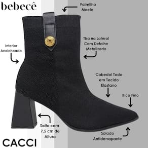 Ousada, moderna e cheia de estilo: essa bota da Bebecê vai conquistar seu coração! Com visual sofisticado e acabamento impecável, essa bota é feita para mulheres que amam unir conforto e elegância em um único look. O cabedal todo em tecido elastano se ajusta perfeitamente ao formato da perna, proporcionando um calce firme, confortável e com aquele toque moderno que só a Bebecê tem! O salto de 7,5 cm dá o equilíbrio ideal entre altura e estabilidade, garantindo postura elegante sem abrir mão do conforto para o dia todo. Já o bico fino alonga a silhueta e valoriza qualquer produção, seja casual ou mais elaborada. O detalhe metalizado na lateral traz um toque fashion que faz toda a diferença um charme sutil que eleva o visual! E por dentro, você conta com interior acolchoado e palmilha macia, pensados para deixar seus passos mais leves e confortáveis. Além disso, o solado antiderrapante oferece mais segurança para o seu dia a dia, mesmo em pisos lisos. Perfeita para usar com jeans skinny, saias midi, vestidos ou até mesmo com peças mais fashionistas! Quer se destacar com elegância e conforto? Essa bota Bebecê é o seu match perfeito!