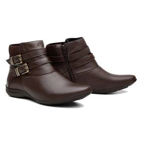 Bota Flat em Couro Feminino Rasteira Zíper Elástico Atrás Fivela Confortável - 38 - Marrom