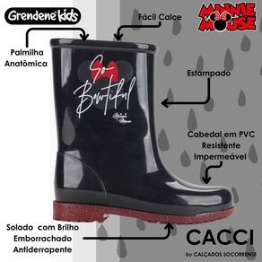 Dê um passinho mágico na chuva com as novas galochas da Minnie. Esta galocha encantadora traz um toque de brilho com sua sola translúcida e reluzente, perfeita para brincar sob a chuva ou pular em poças. O cabedal é adornado com uma serigrafia vibrante, destacando a adorável silhueta da Minnie em tons alegres e femininos. Cada par é uma verdadeira fantasia dos personagens, com grafias personalizadas que contam histórias encantadoras. A capa vem fechamentos em botão de pressão no pescoço e nas mangas, é fácil vestir e sair para se divertir, mesmo nos dias chuvosos!