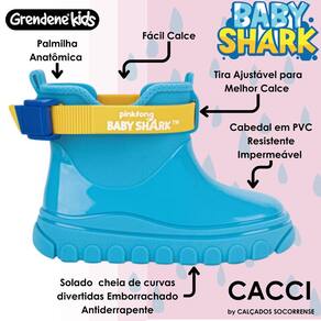 Essas galochas são mais do que simples calçados, são companheiras de brincadeiras sob a chuva! Feitas de PVC resistente e com uma sola cheia de curvas divertidas, cada passo é uma nova descoberta. A parte de cima é toda enfeitada com texturas a laser, simulando um oceano de cores e formas. E não podemos esquecer dos detalhes encantadores, como os dentinhos e a cauda do Baby Shark em 3D na capa de chuva, que deixam os pequenos ainda mais animados para enfrentar a chuva. Com fechamento fácil e ajustável, esse combo de galocha é perfeito para os dias chuvosos cheios de diversão.